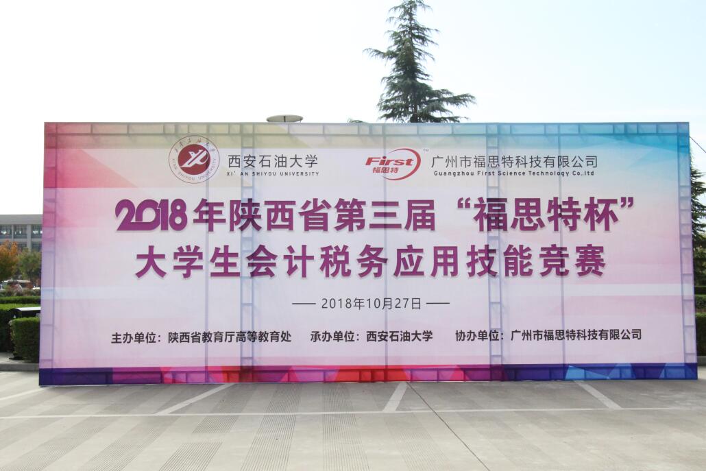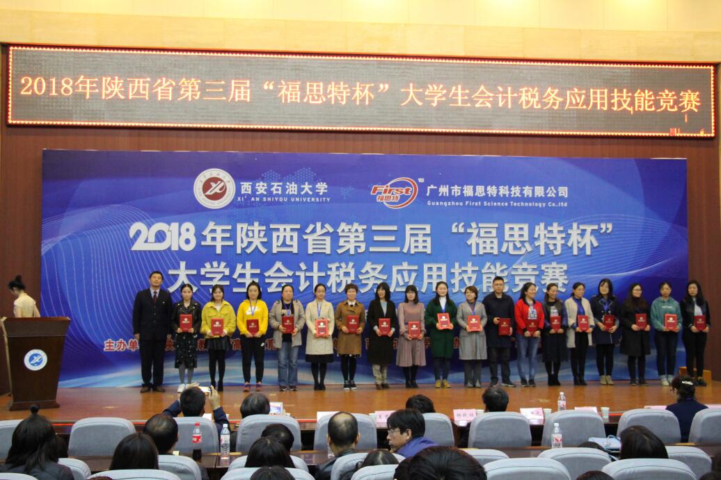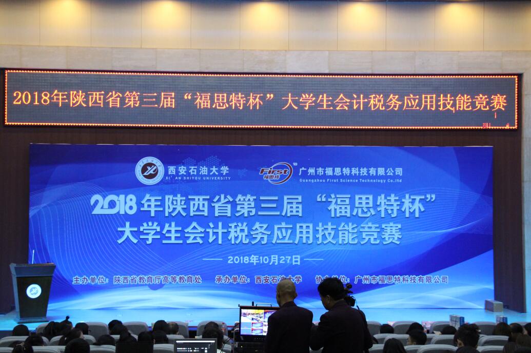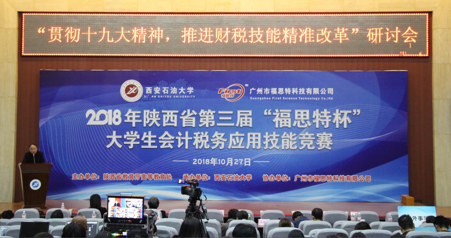 2018年10月27日,由陜西省教育廳高等教育處主辦、西安石油大學承辦、廣州市福思特科技有限公司提供技術支持的2018年陜西省第三屆“福思特杯”大學生會計稅務應用技能競賽暨“貫徹十九大精神,推進財稅技能精準改革”研討會在西安石油大學鄠邑校區隆重舉行。陜西省財政廳副巡視員、會計處處長王素文,陜西省教育廳高等教育處趙登攀,西安石油大學副校長楊戰社,西安交通大學管理學院會計與財務系主任、教授田高良,陜西財經職業技術學院副校長范忠以及廣州市福思特科技有限公司董事長閆曉霞等出席會議。來自全省50余所高校、600多名師生參加了比賽。